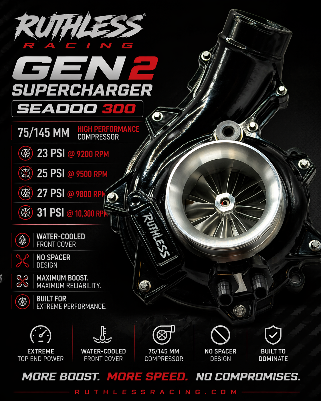 Unleash the full potential of your Sea-Doo 300 with the R‑145 SuperCharger. Engineered for extreme performance, this Gen2 supercharger is designed to deliver a massive boost with precision balancing and high-efficiency airflow.